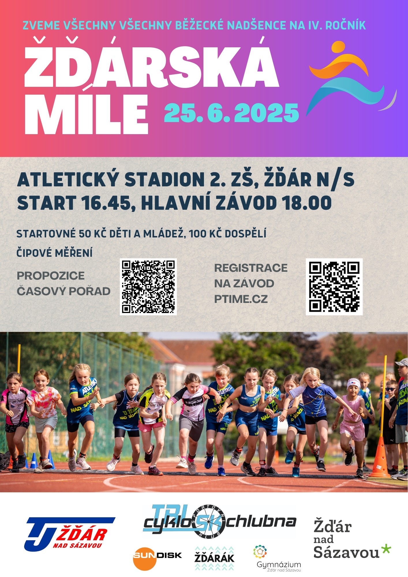 Běžecká akce Žďárská míle se v letech 2022, 2023 a 2024 setkala se zájmem veřejnosti, propojila malé, mladé i dospělé sportovce z různých žďárských klubů i veřejnosti a společná setkání byla sportovním svátkem. Letos se akce koná ve středu 25.6., na hřišti Komenského 2, od 16:30. Můžete se opět těšit na oblíbené atletické disciplíny 100,300 a 1000 metrů pro děti a mládež a na hlavní závod v běhu na 1 anglickou míli pro muže a ženy od 18 h. Těšíme se na vás, přijďte si zasportovat nebo zafandit. Startovné pro děti a mládež je 50,-Kč a pro dospělé 100,-Kč. Za atletický oddíl TJ Žďár nad Sázavou srdečně zve Lenka Formanová, za tým Žďárák Lukáš Bořil a za SK Tricyklochlubna Petr Bezchleba.